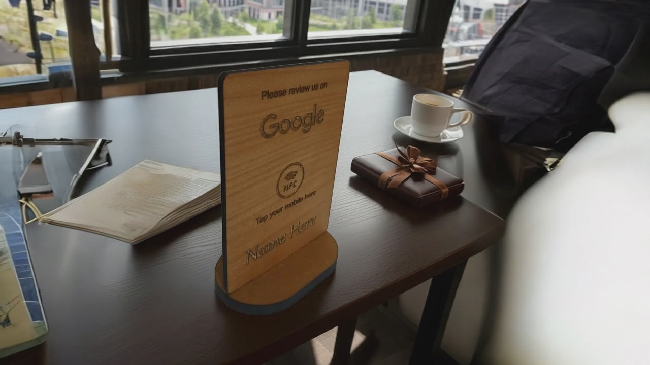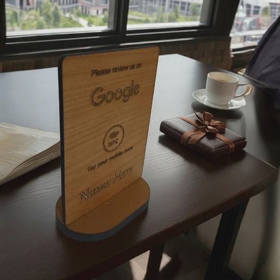 The Tap to Review Sign and stand with NFC Tag offers convenient and efficient customer reviews via tap technology. Made with quality steamed beech wood, it's durable, water-resistant, and easy to clean. The sign comes with a stand and is very easy to set up and use, all at a great price. The sign and stand are treated with food safe natural mineral oils.