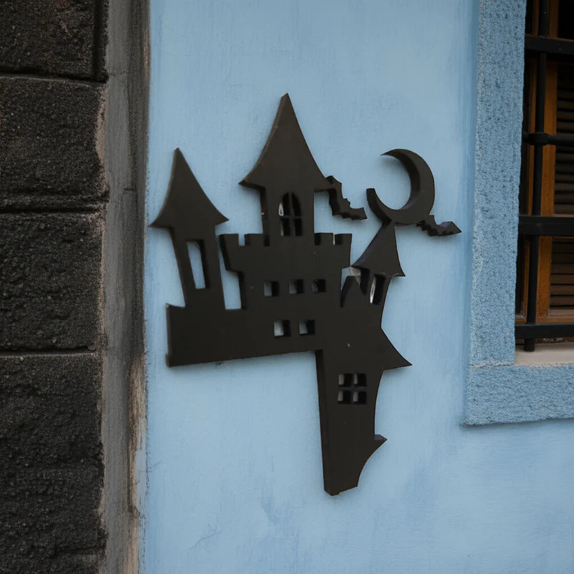 2 Halloween Spooky Castle Wall or Door Plaques, with non-marking, double sided tape to affix. Made from our Black Topped Wood, which we then treat with mineral oils, to protect the wood, make them water resistant and to bring out the engravings.