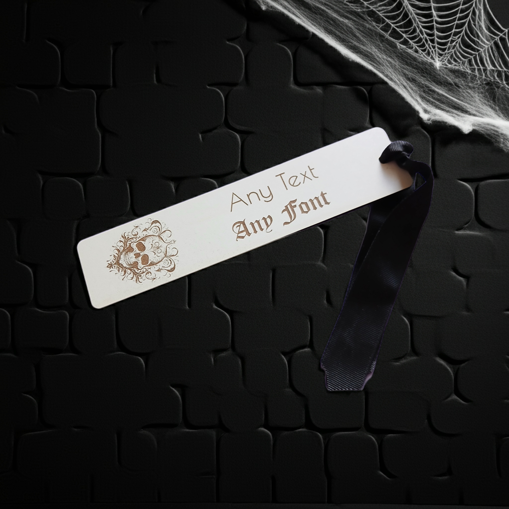 Crafted from UK-sourced white-topped wood in Thanet, Kent, this personalised Halloween bookmark features intricate, striking engravings of a skull that perfectly complement your spooky reads. Customise with any text and font for a unique keepsake that combines macabre elegance with thoughtful craftsmanship. Ideal for enthusiasts of haunting tales who appreciate detailed artistry in every page turn.