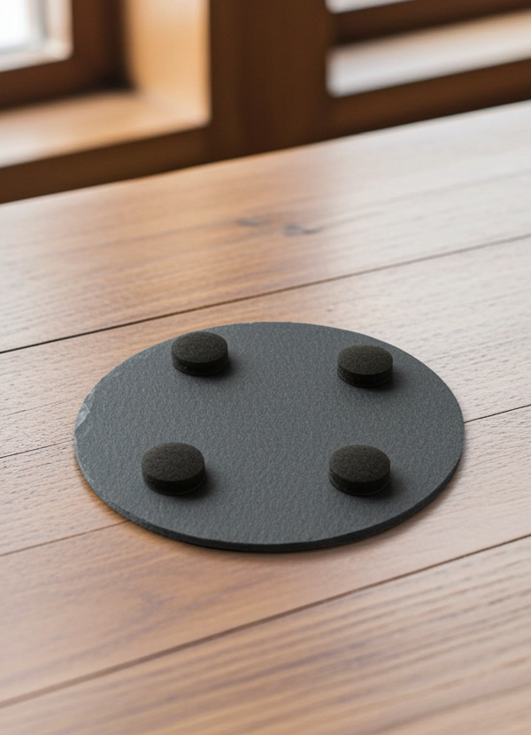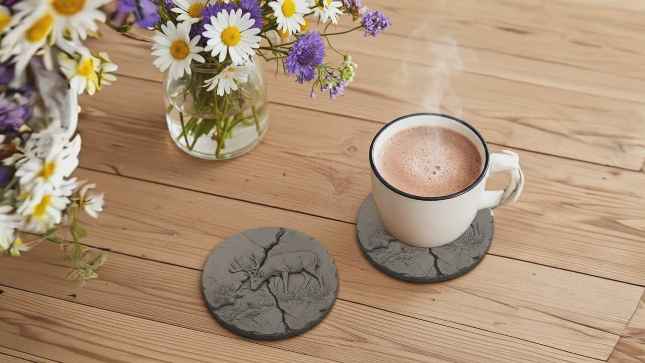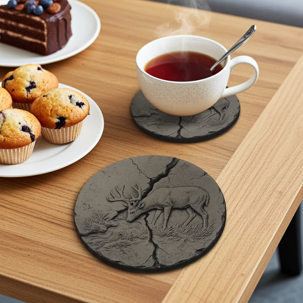 Elevate your table setting with these exquisite slate coasters, Crafted by H&B Thanet using UK-sourced stone. Each piece features a striking 3D engraved stag set against a fractured earth backdrop, creating visual depth and artistic appeal. The chunky round slate sits securely on protective bumper feet, safeguarding your furniture whilst maintaining a refined aesthetic. Treated for weather and fluid resistance, these coasters handle both hot and cold beverages with ease. This versatile set of four serves as both a stylish functional addition to your home The set would be a sophisticated keepsake, or as a gift.
