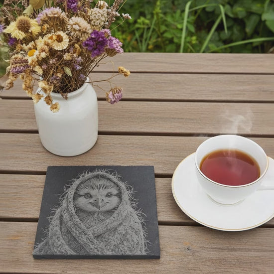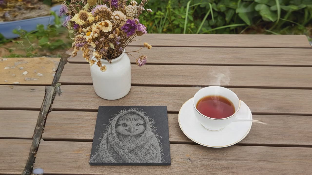 Elevate your table setting with this exquisite collection of four slate coasters, each featuring a meticulously engraved cute bird adorned in a charming shawl. Crafted from premium UK-sourced slate and treated for fluid resistance, these 10cm x 10cm coasters combine functionality with artistic appeal. Fitted with protective bumper feet to safeguard your furniture, they offer both style and practicality. A sophisticated addition to any home, this unique collection showcases the refined craftsmanship of H & B Thanet, making it an ideal gift for those who appreciate distinctive, professionally designed homeware.