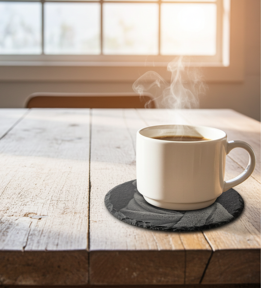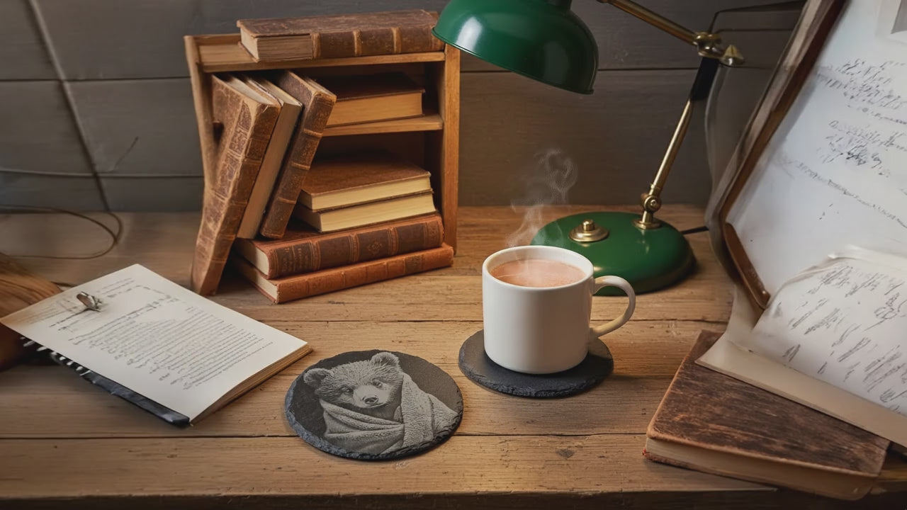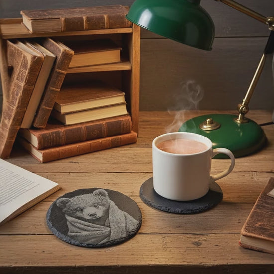 Raise your table setting with this exquisite set of four round slate coasters, each featuring a meticulously detailed photorealistic engraving of a bear nestled in a blanket. Crafted from premium treated slate, these coasters combine natural beauty with exceptional functionality. The protective bumper feet safeguard your furniture whilst the fluid-resistant surface effortlessly handles both hot and cold beverages. Stackable for convenient storage, these durable, weather-proof coasters are made to order by H & B Thanet, ensuring each piece is uniquely crafted to perfection. A sophisticated addition to any home.