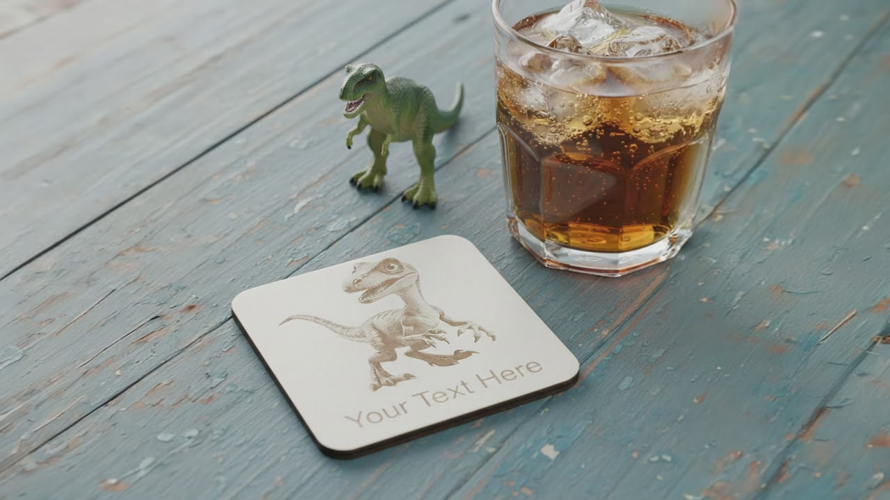 Set of 4 bespoke wooden coasters featuring intricately engraved dinosaur designs, crafted in Thanet, Kent. Each 9.5cm square coaster bis made from white topped wood, with protective bumper feet to safeguard your furniture. Personalise with any text and font of your choice, making them ideal gifts for dinosaur enthusiasts of all ages. Durable and functional, these coasters handle both hot and cold beverages with ease. Simply wipe clean and buff dry after use—do not use in a dishwasher. Exceptional quality at an outstanding price.