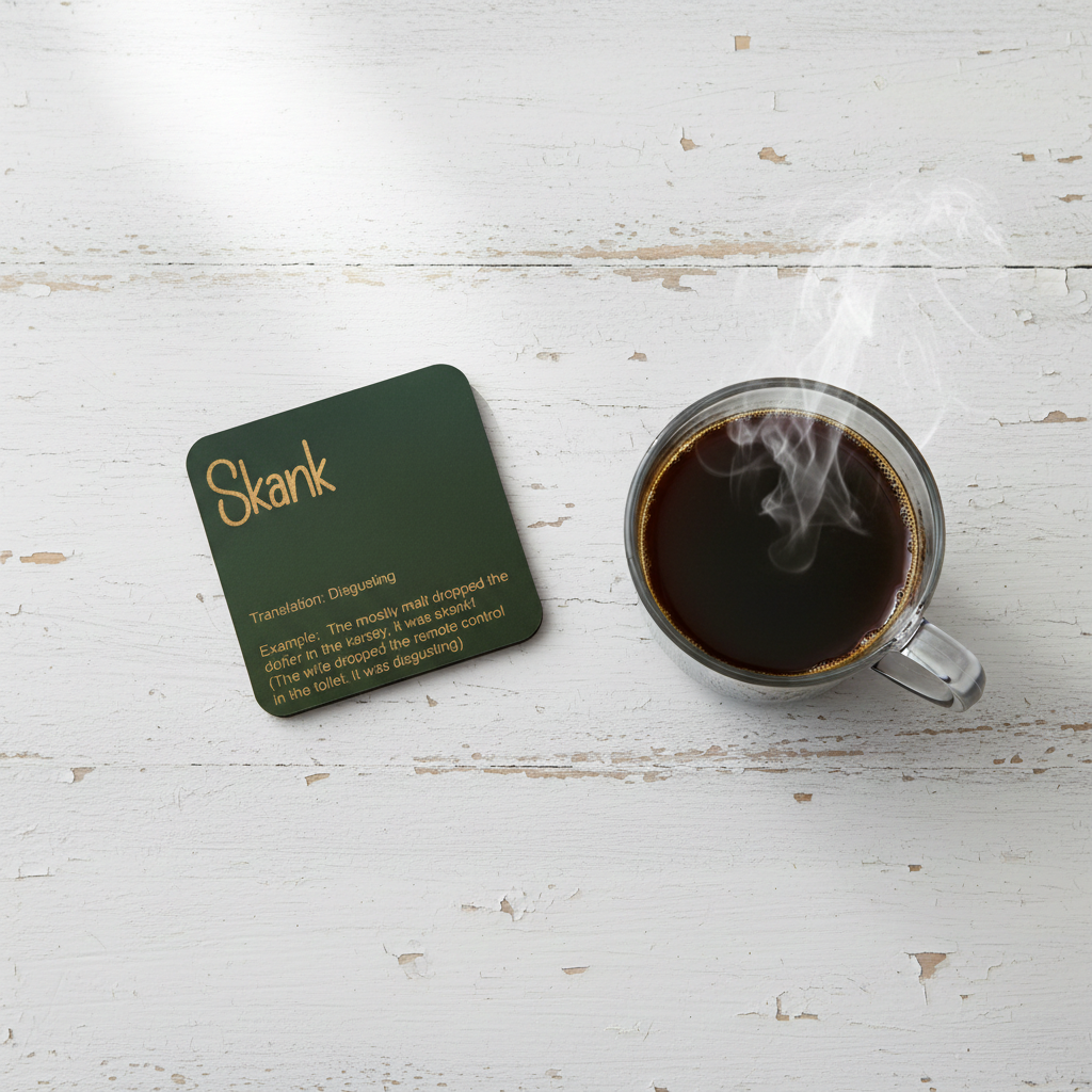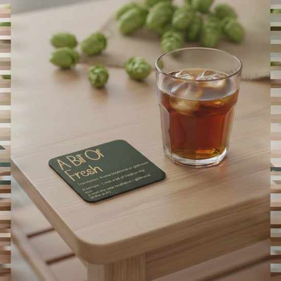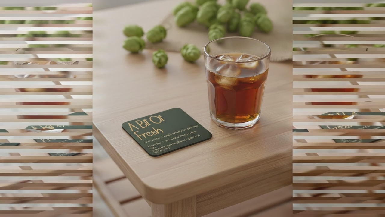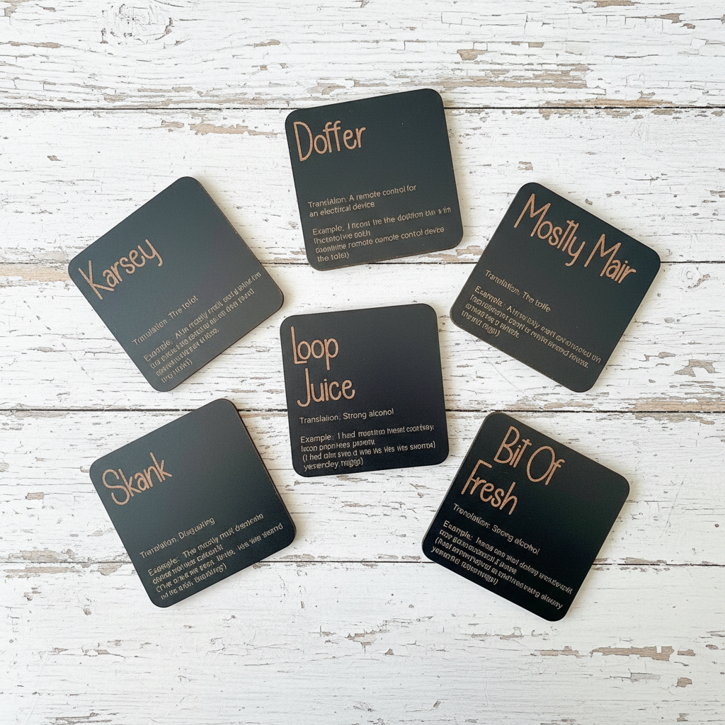 Celebrate Kentish heritage with this, quirky and elegant set of six black-topped wooden coasters, engraved with unique local words and slang. Each 10cm square coaster features clear, precise engravings on UK-sourced wood treated with natural mineral oils for water resistance. Designed and crafted in Thanet, Kent, they offer practical protection for both hot and cold drinks, supported by discreet bumper feet and a stackable design. A refined gift choice, these coasters are easy to clean with a damp cloth and then for best results buff dry. They are a true embody of true Kentish pride. Made to order for distinctive style and lasting quality.