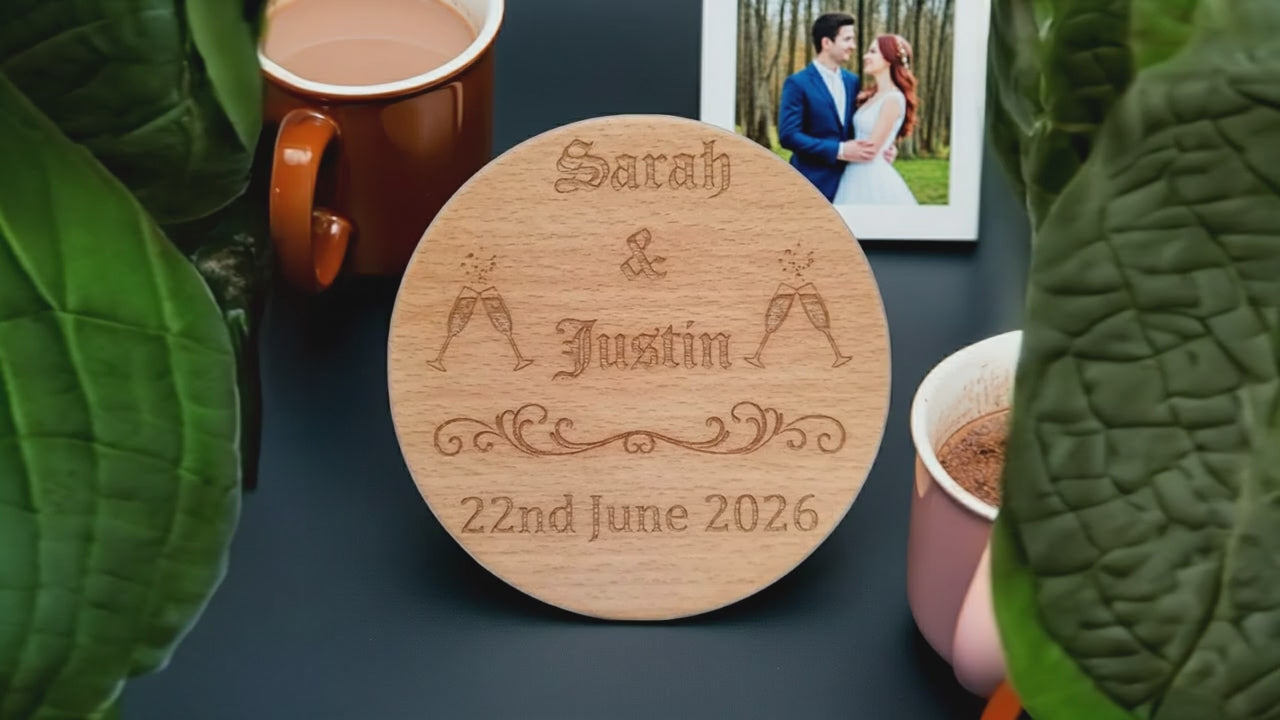 Each coaster measures 9.5 cm in diameter and has bumper feet to further protect surfaces. These coasters are lightweight and stackable, making them easy to store. They are handmade in the United Kingdom and can be personalised with your choice of engraving, such as names or dates. Get creative and make your coasters unique!