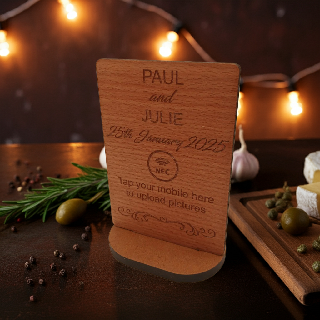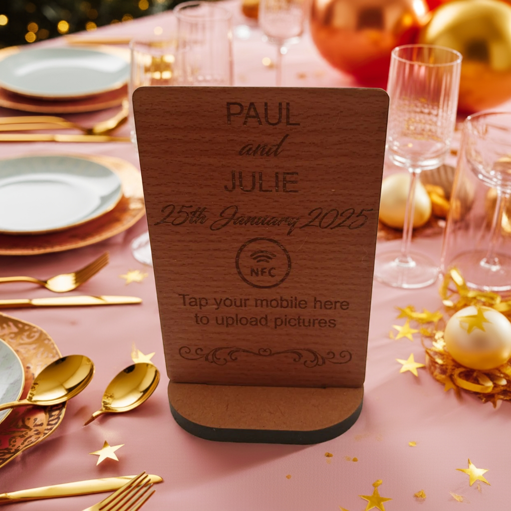 Photo Sharing and uploading Sign with Stand. Sign can be engraved with two names, the date and year. Comes with the NFC Symbol and instructions for guests to tap phone.